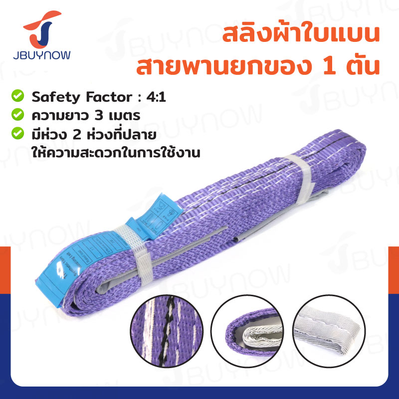 สลิงผ้าใบแบน สายพานยกของ (เซฟตี้ 4:1 มีใบเซอร์) 1 ตัน ยาว 3 เมตร JBUYNOW 1Tx3M