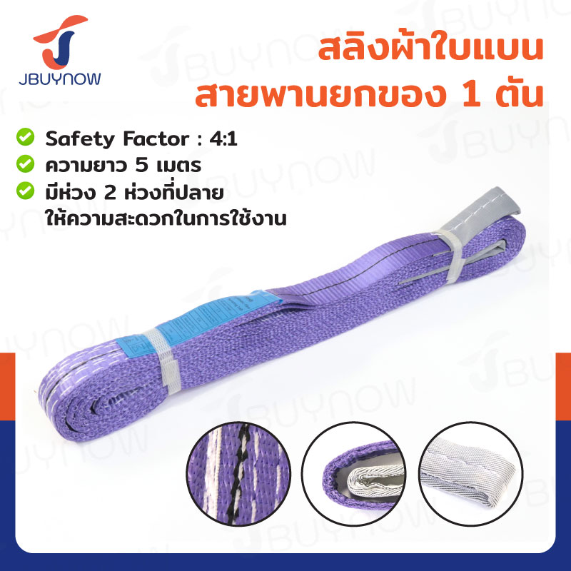 สลิงผ้าใบแบน สายพานยกของ (เซฟตี้ 4:1 มีใบเซอร์) 1 ตัน ยาว 5 เมตร JBUYNOW 1Tx5M