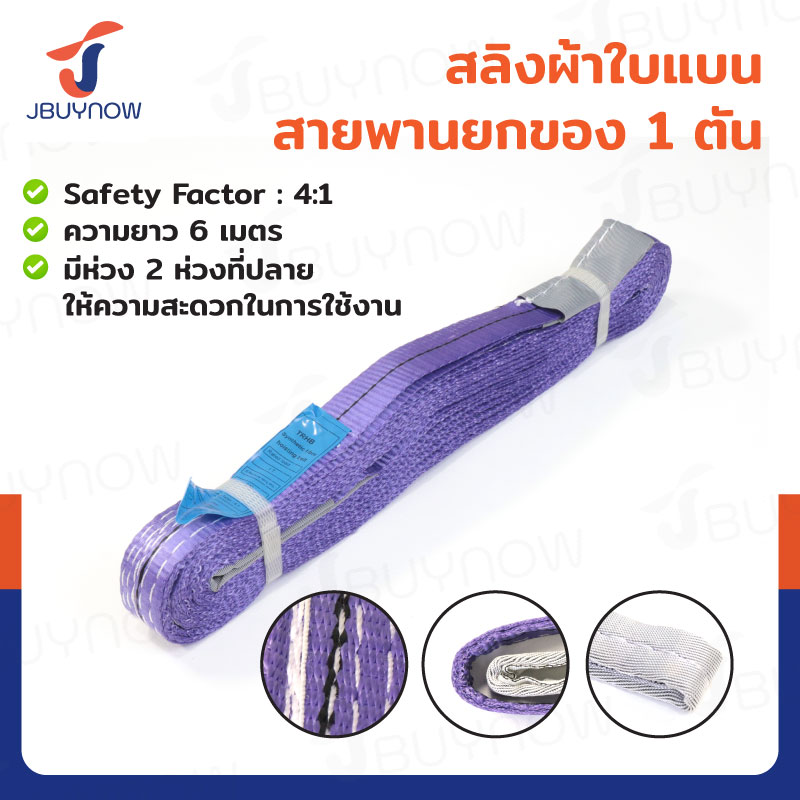 สลิงผ้าใบแบน สายพานยกของ (เซฟตี้ 4:1 มีใบเซอร์) 1 ตัน ยาว 6 เมตร JBUYNOW 1Tx6M