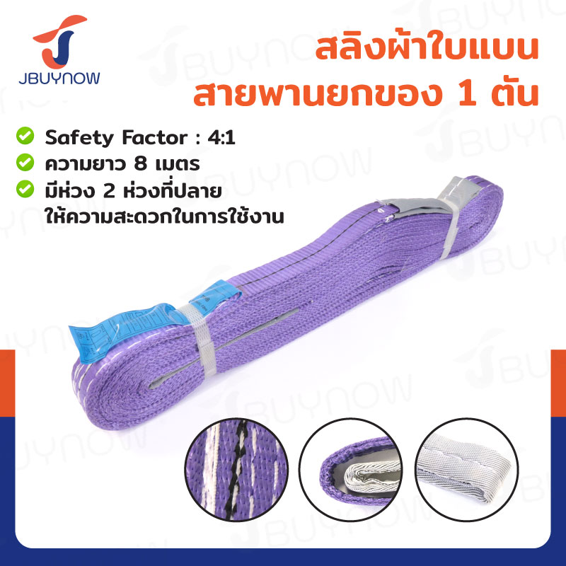 สลิงผ้าใบแบน สายพานยกของ (เซฟตี้ 4:1 มีใบเซอร์) 1 ตัน ยาว 8 เมตร JBUYNOW 1Tx8M