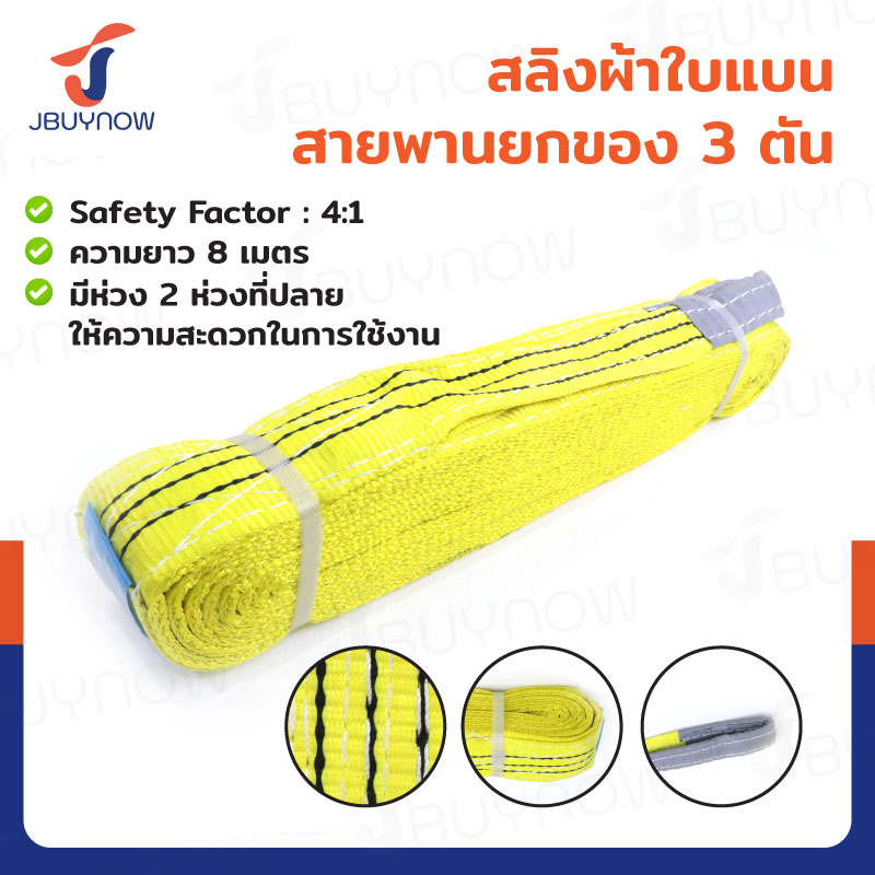 สลิงผ้าใบแบน สายพานยกของ (เซฟตี้ 4:1 มีใบเซอร์) 3 ตัน ยาว 8 เมตร JBUYNOW 3TX8M