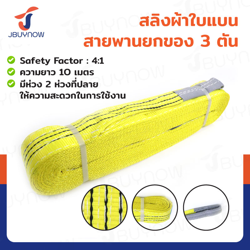 สลิงผ้าใบแบน สายพานยกของ (เซฟตี้ 4:1 มีใบเซอร์) 3 ตัน ยาว 10 เมตร JBUYNOW 3TX10M