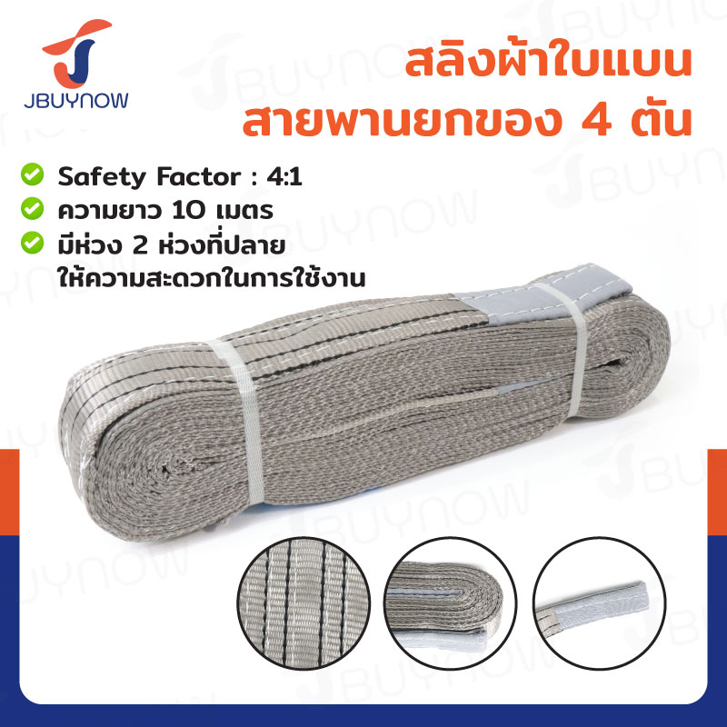 สลิงผ้าใบแบน สายพานยกของ (เซฟตี้ 4:1 มีใบเซอร์) 4 ตัน ยาว 10 เมตร JBUYNOW 4TX10M