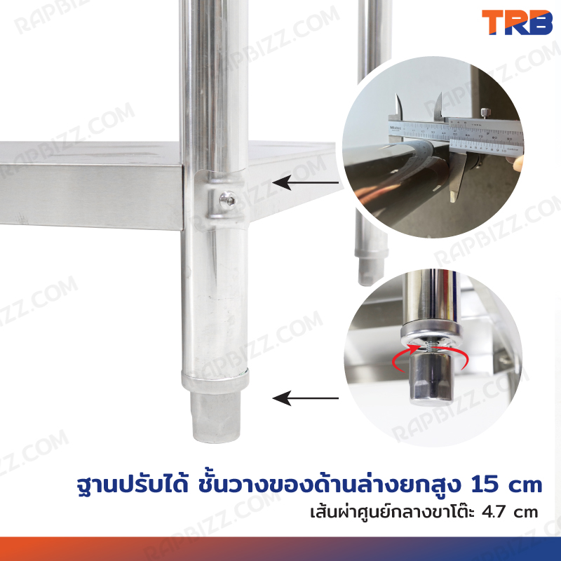 - หน้าโต๊ะหนา 6.5 cm ใช้แผ่นสแตนเลสหนา 0.7 mm (+/-0.05mm)