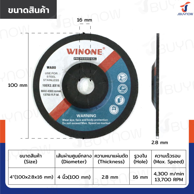 - ขนาดใบเจียร: 100x2.8x16 mm