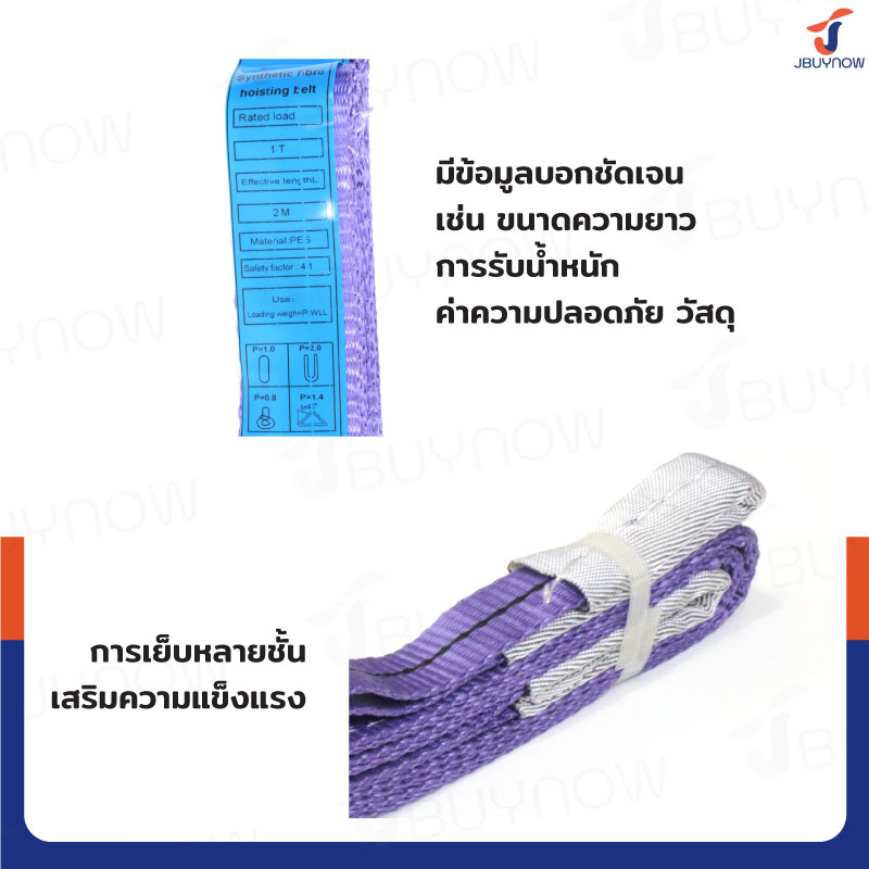 สลิงผ้าใบแบน สายพานยกของ (เซฟตี้ 4:1 มีใบเซอร์) 1 ตัน ยาว 2 เมตร JBUYNOW 1TX2M