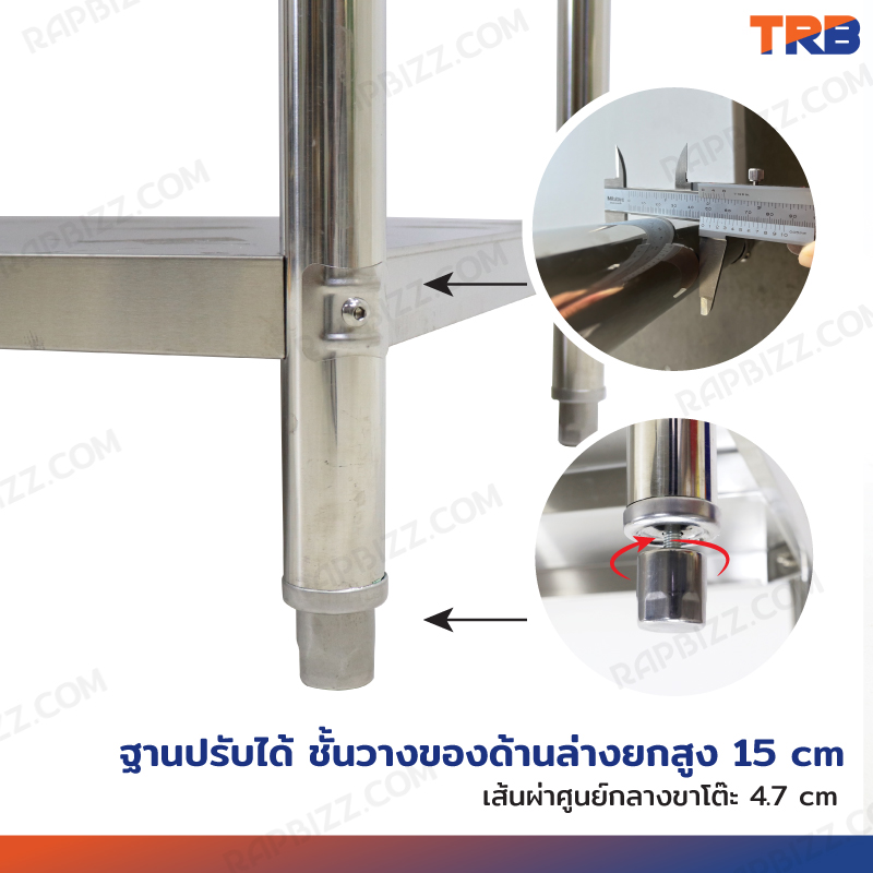 - หน้าโต๊ะหนา 6.5 cm ใช้แผ่นสแตนเลสหนา 0.7 mm (+/-0.05mm)