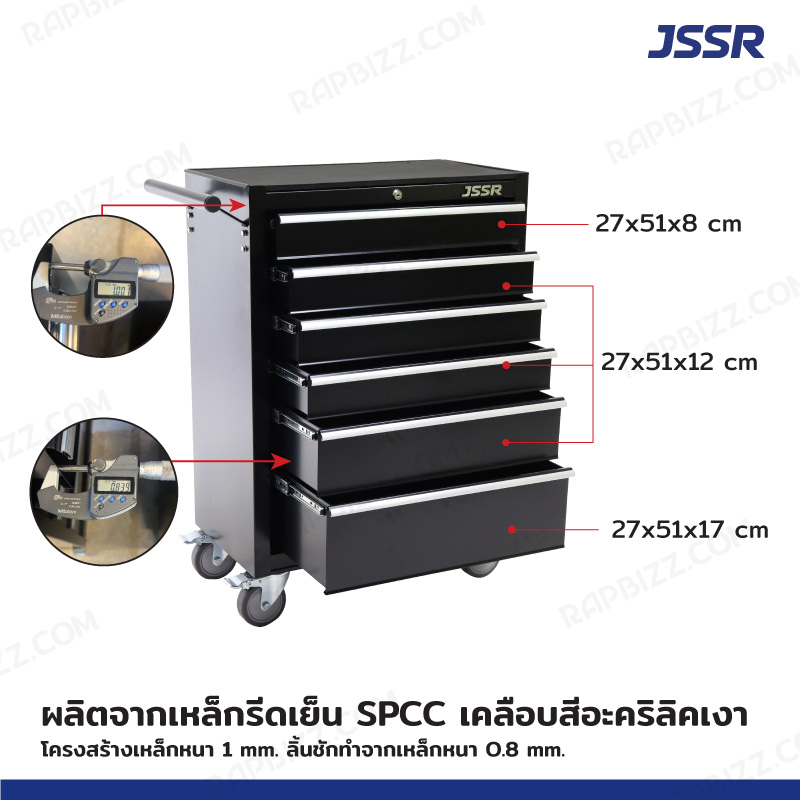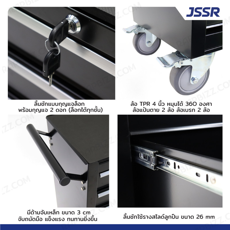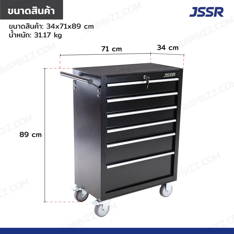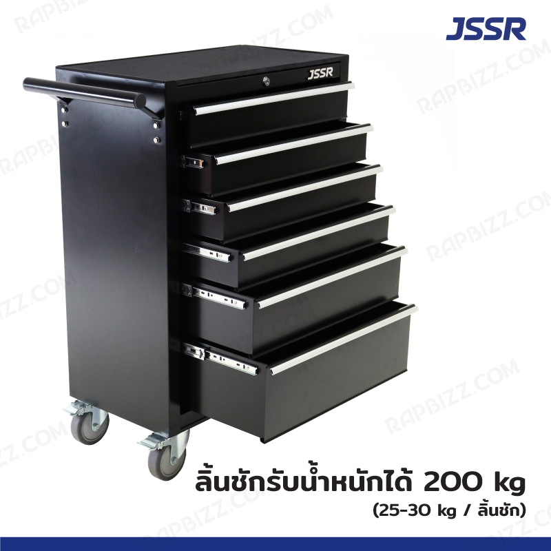 ตู้เครื่องมือ 6 ลิ้นชัก มีกุญแจล็อค 34x71x89 ซม. สีดำ รุ่นล้อใหญ่ 4 นิ้ว(เสียงเงียบ) JBUYNOW JSSR