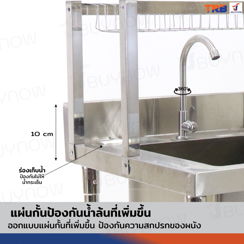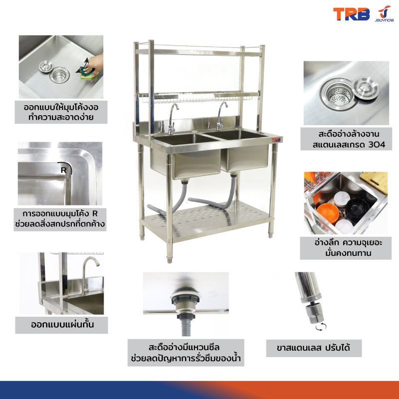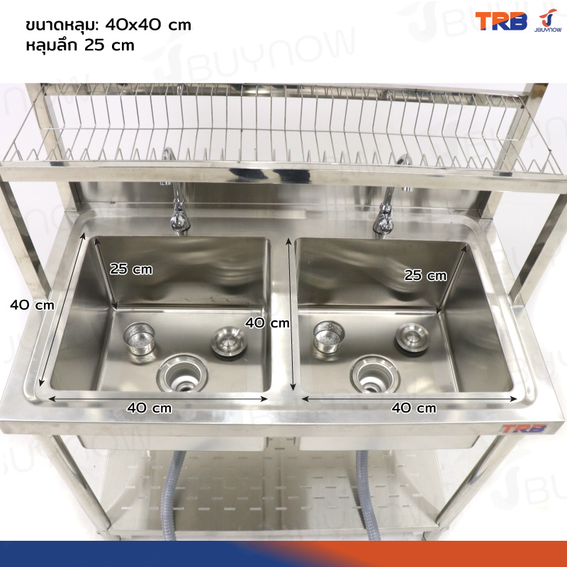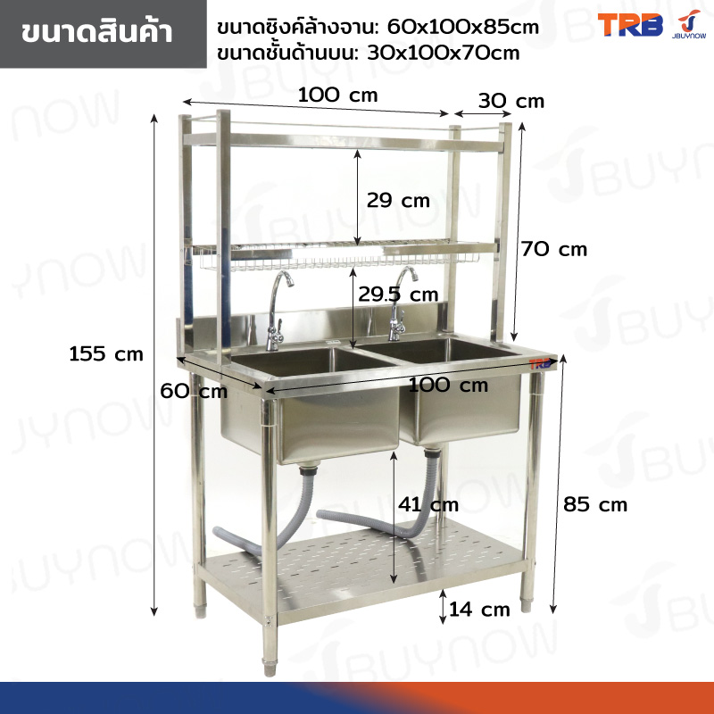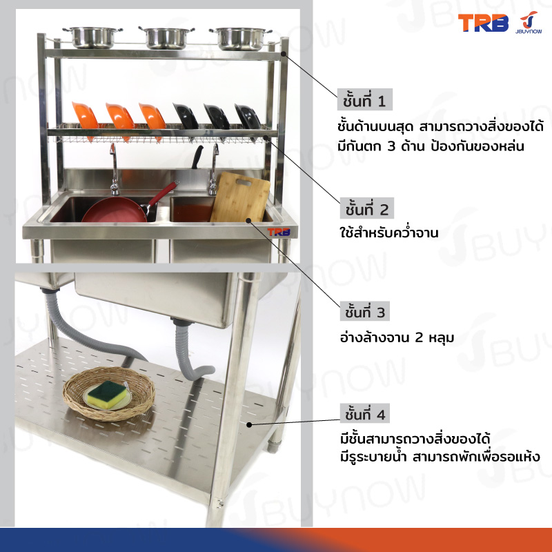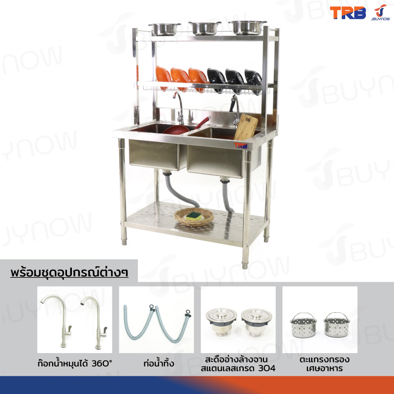 ซิงค์ล้างจาน 2 หลุม 2ที่คว่ำจาน+1ชั้นวางใต้ซิงค์ SUS201 60x100x155cm JBUYNOW TRB RB230531-3-2L