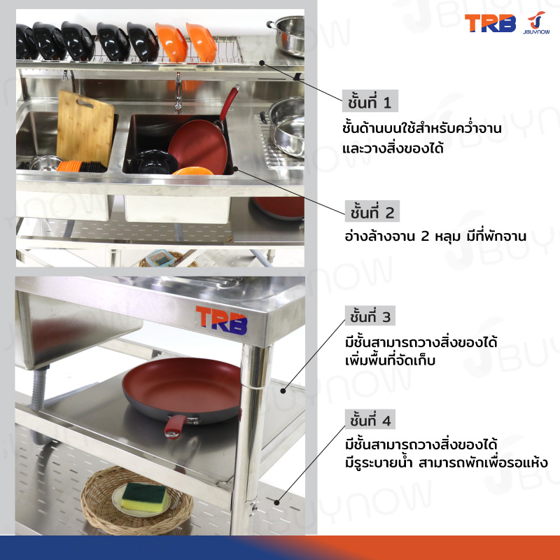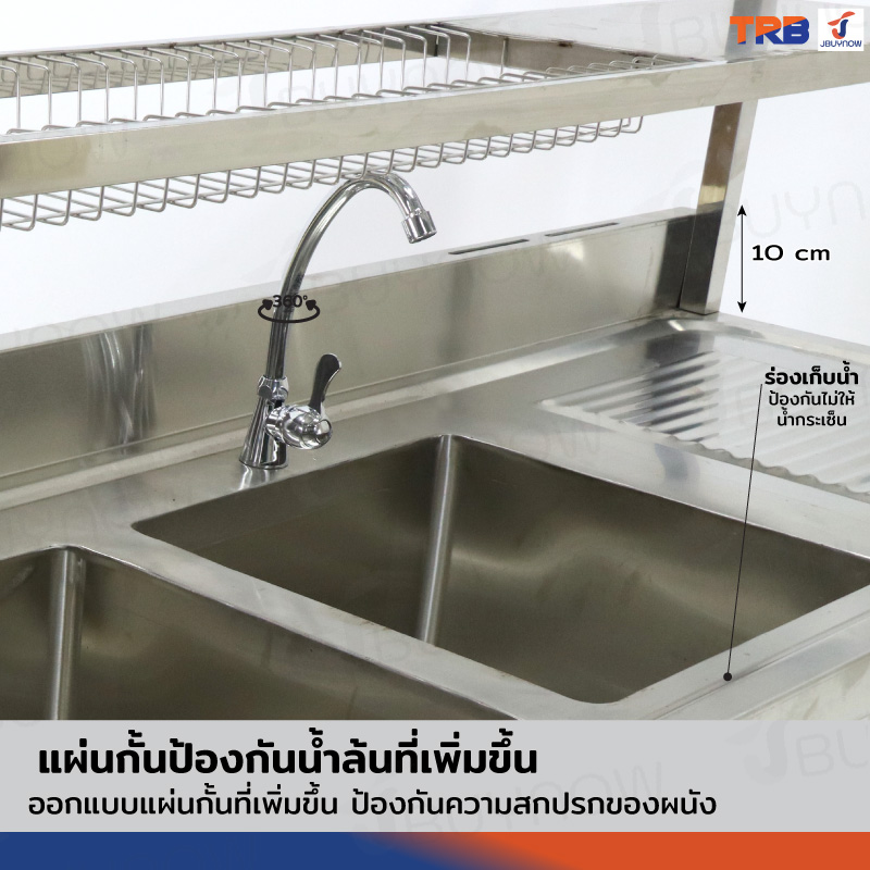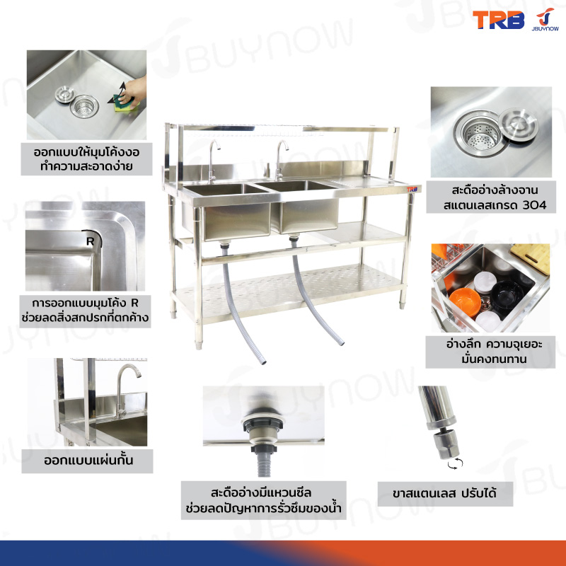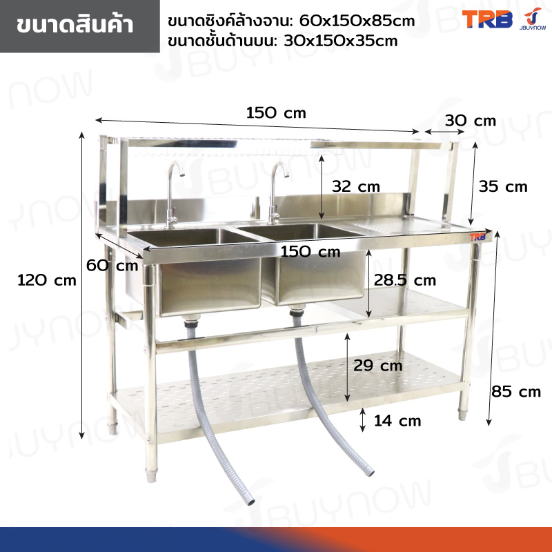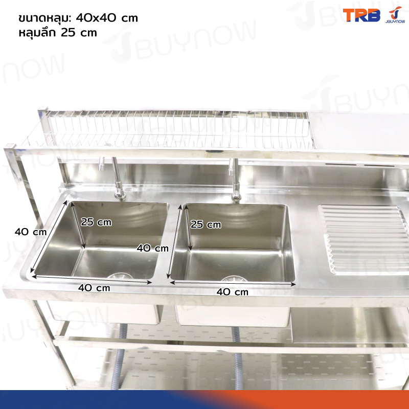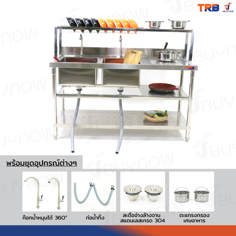 ซิงค์ล้างจาน 2 หลุม มีที่พักจาน 1ที่คว่ำจาน+2ชั้นวางใต้ซิงค์ สแตนเลสเกรด 201 60x150x120cm JBUYNOW TRB RB230531-4-1L